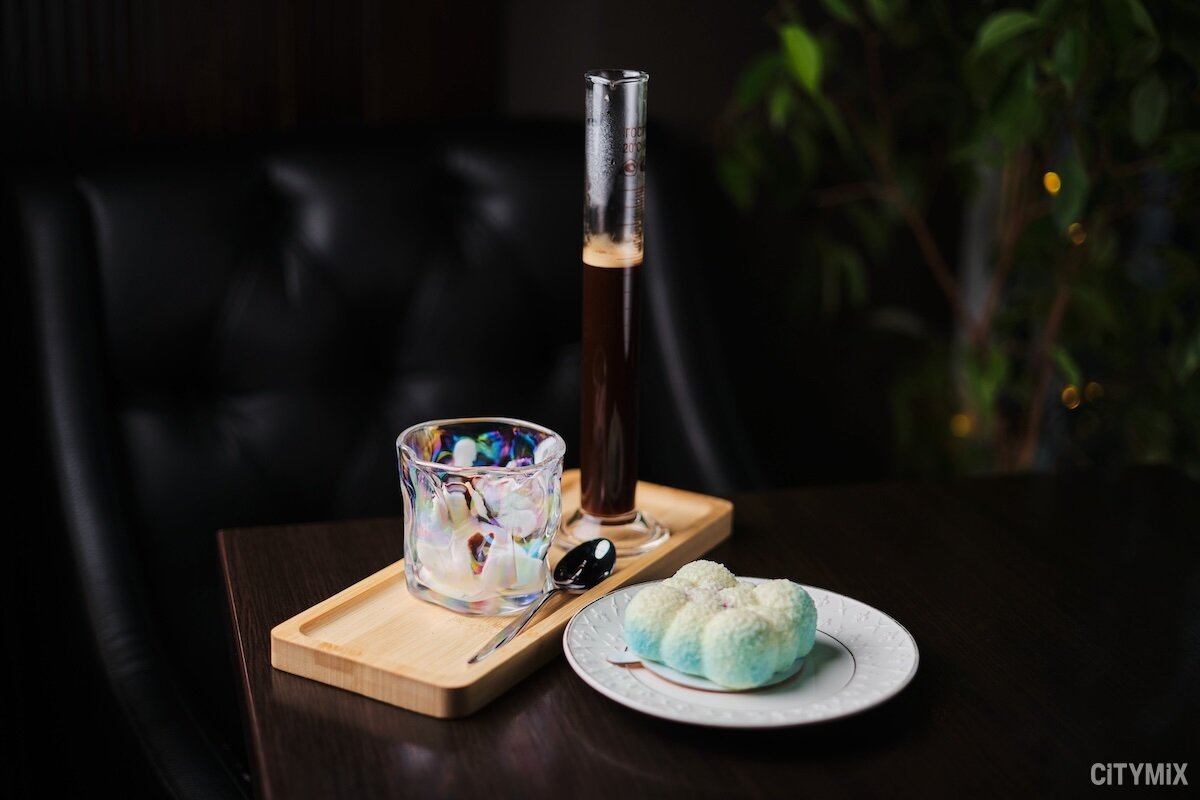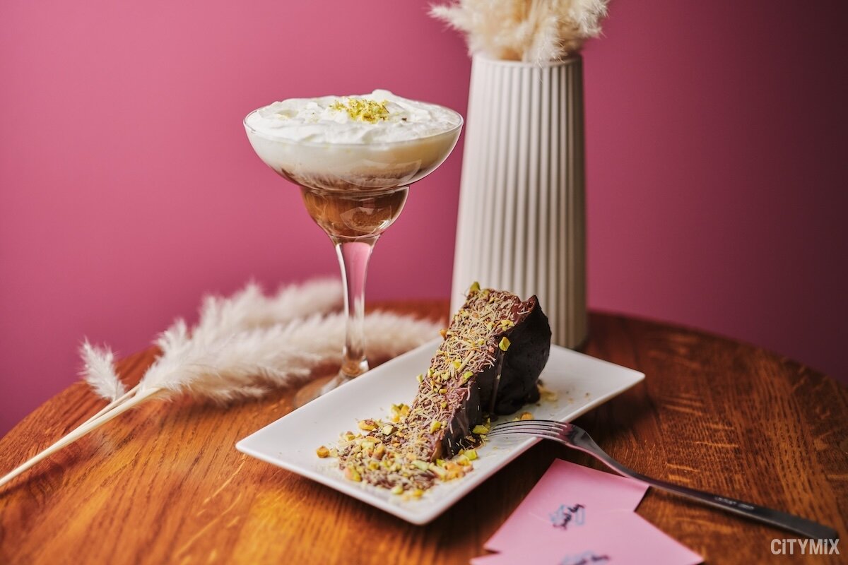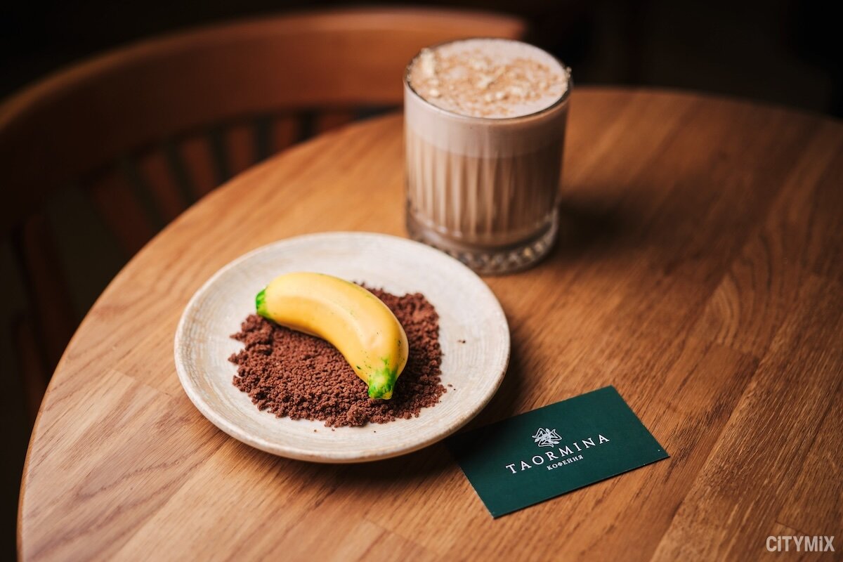 - Американо с натуральным шоколадно-вишнёвым сиропом, взбитыми сливками собственного приготовления на основе фисташки и посыпкой из фисташковой крошки — 250 мл