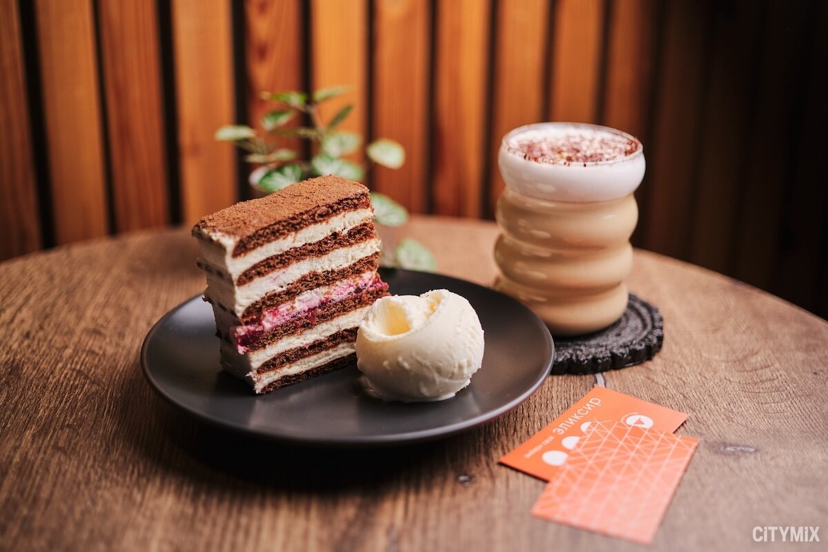 - Шоколадный медовик с вишней и шариком сливочного мороженого — 150 г