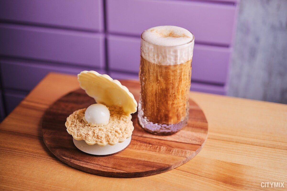 - Десерт «Жамчужына» (ракушка из белого шоколада, песочная основа, наполненная воздушным кремом. Внутри жемчужины — облепиховое пюре с нотками специй) — 110 г