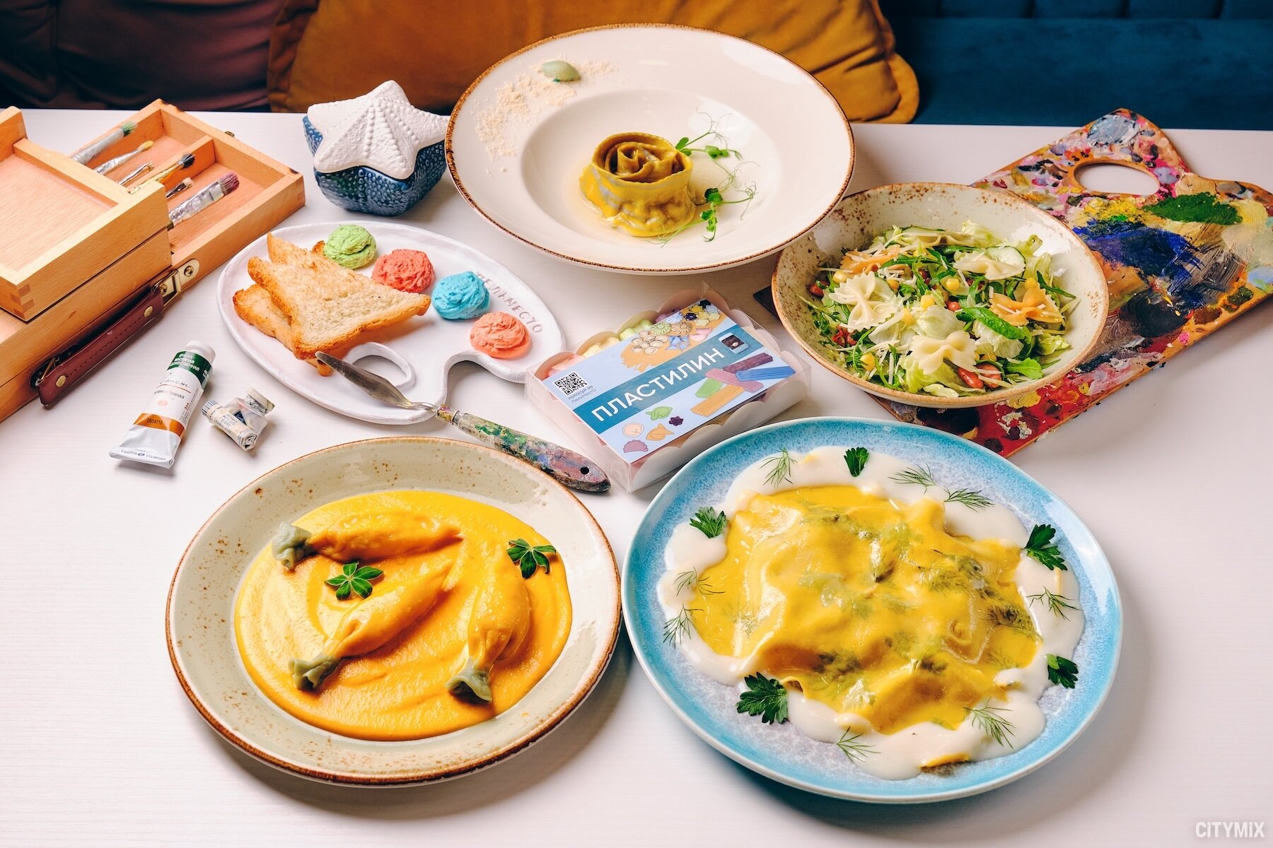 - Картина «Оранжевое настроение». Равиоли с фетой и беконом в пряном морковно-сливочном соусе.