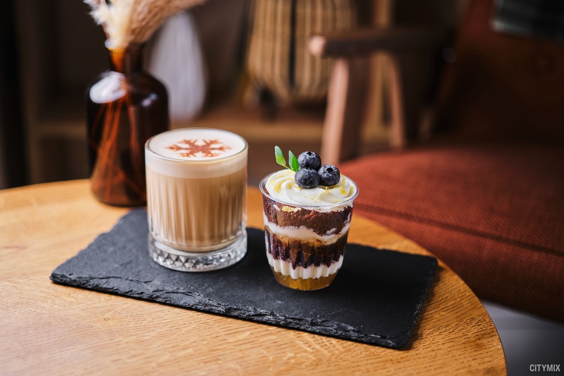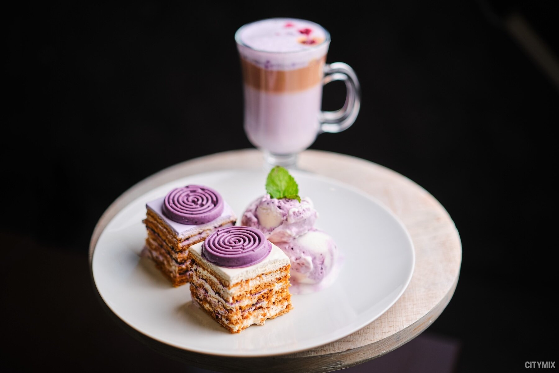 - Воздушный бисквит с добавлением меда, пропитанный сладким сметанно-сливочным кремом с прослойкой из свежих ягод черники, украшенный ганашем на основе белого шоколада с добавлением черничного кули. Подается с мороженым, декорированным листочками свежей мяты — 315 г