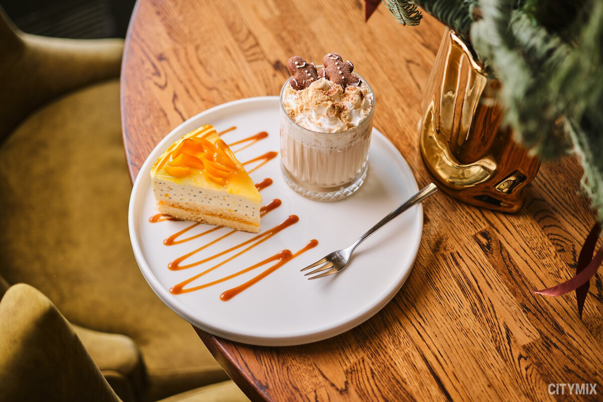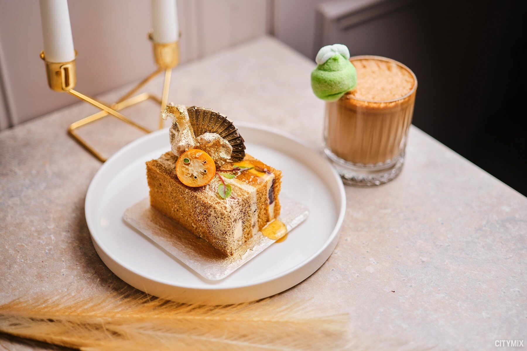 - Зимний медовик (пряный медовый бисквит с легким сметанным кремом с мандариновым соусом и кусочками желированного глинтвейна) — 130 г