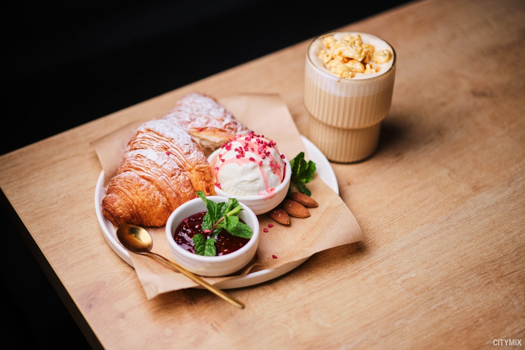 - Ароматный, с хрустящей корочкой круассан. Подается с шариком сливочного пломбира и малиновым джемом. Украшен свежей мятой и ядрами обжаренного миндаля — 135 г