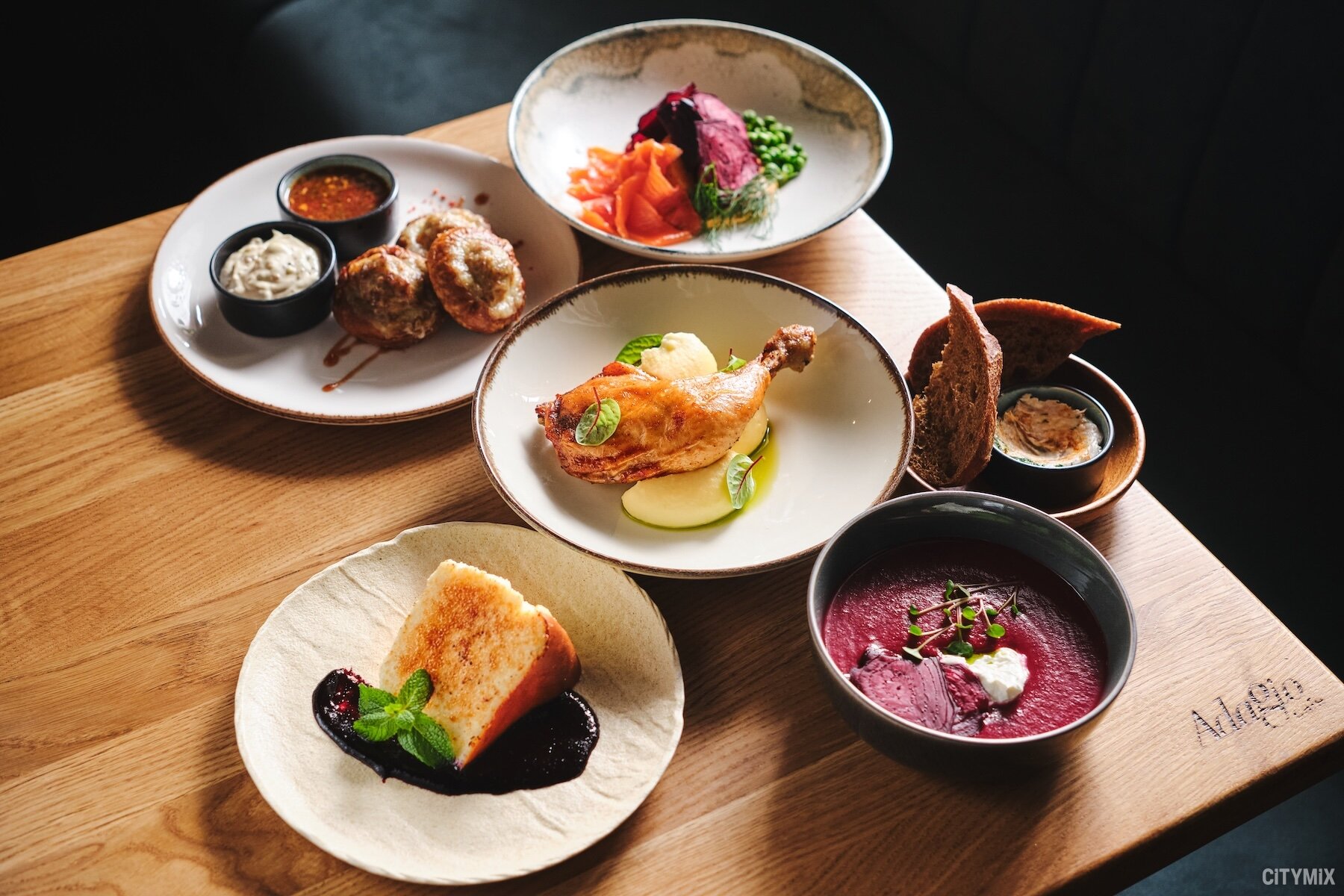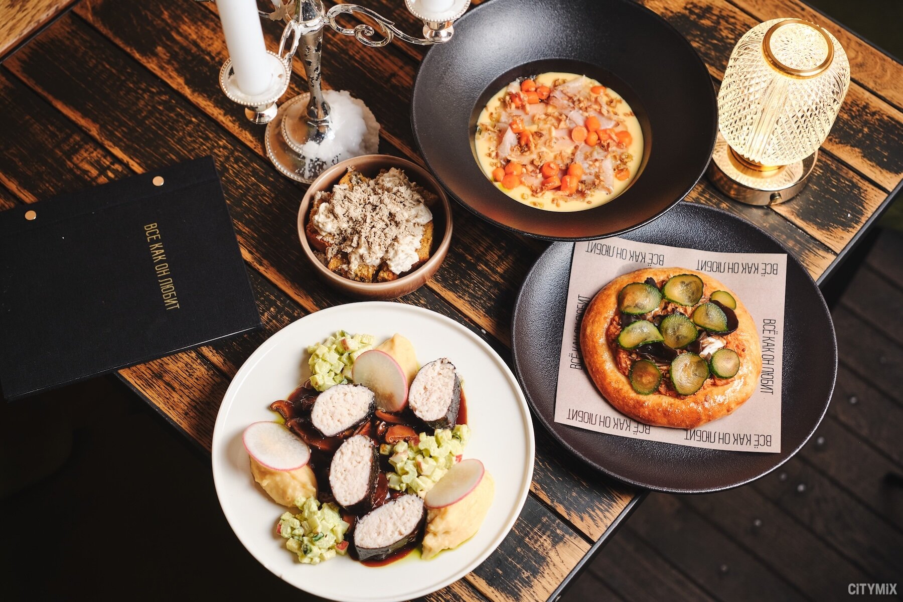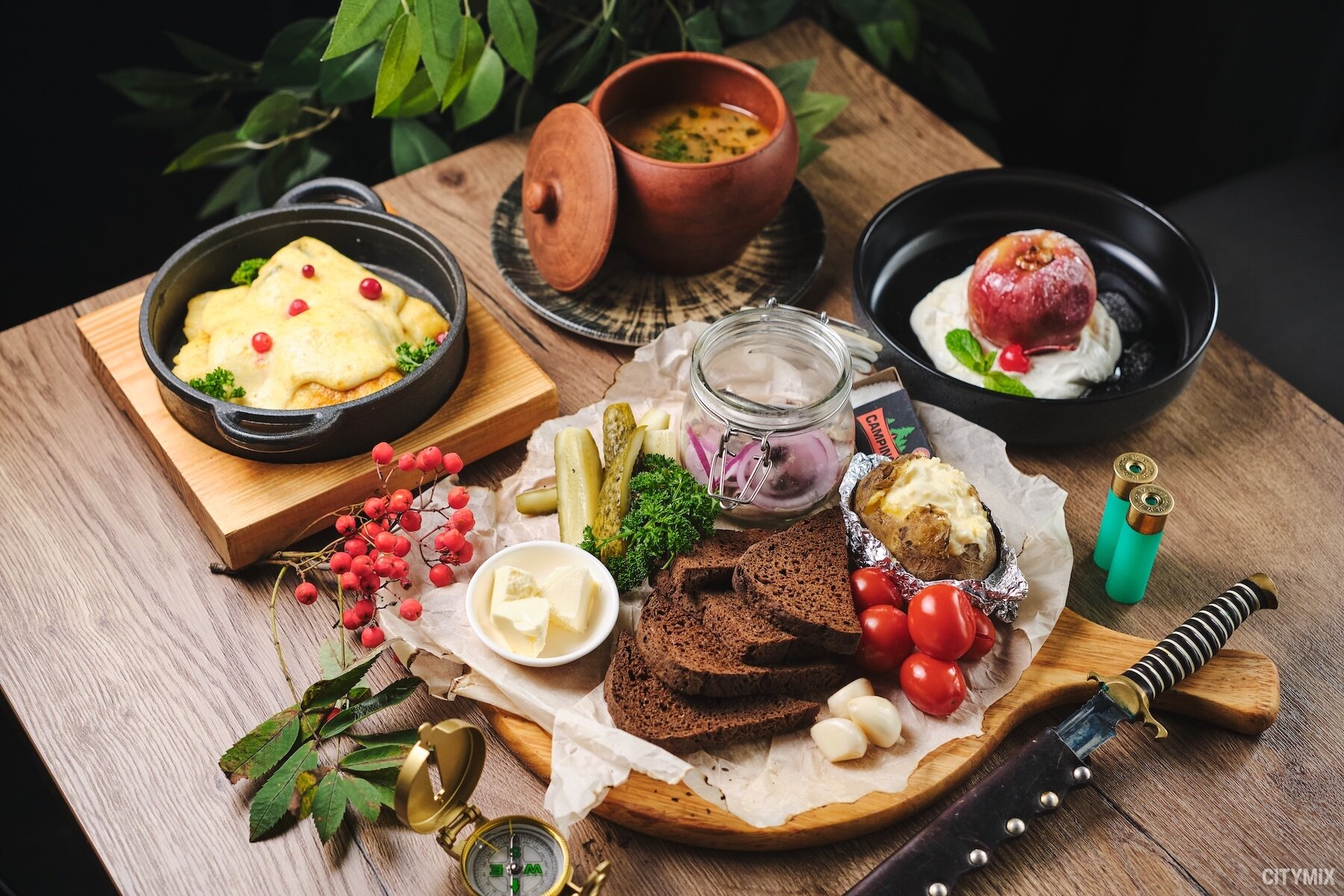 - Смаженка (пшеничная лепешка, томленая свиная лопатка в томатном соусе с зерновой горчицей, трюфельный мусс, маринованные древесные грибы, слабосоленые огурцы, хрустящий лук)