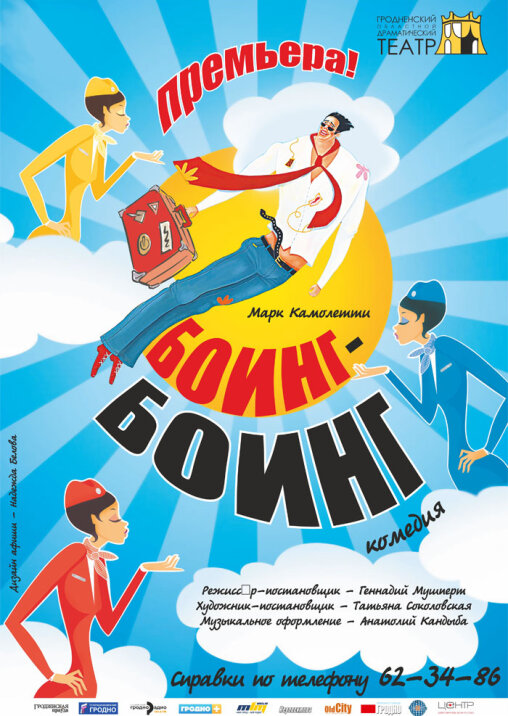 «Боинг-Боинг» — легенда французского театра прошлого века. Образец комедии положений. Пьеса вошла в книгу рекордов Гиннеса, поставлена в 60 странах мира. «Боинг-Боинг» — комедия о романе молодого парижского ловеласа с тремя очаровательными стюардессами. Избранницы летают на разных авиалиниях, и это вынуждает изобретательного жениха подстраивать свою жизнь под расписание «прилета-отлета» всех «невест». Возникающие недоразумения приводят к бесконечно смешным ситуациям…