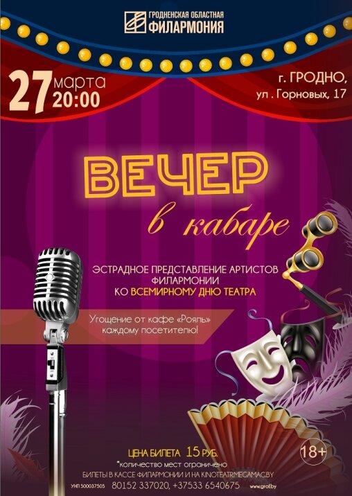 27 марта в честь Всемирного дня театра на камерной сцене Гродненской областной филармонии вас ждёт незабываемый «Вечер в кабаре». Танцы, песни, инструментальная музыка, номера оригинальных жанров и многое другое.