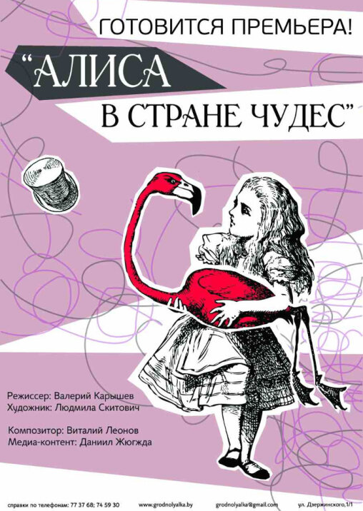 Дети – самые большие фантазёры, которые могут превратить самые простые и скучные вещи в невероятную историю. Наверное, поэтому сказка Льюиса Кэрролла «Алиса в стране чудес» интересна и взрослым, и детям. Тут есть множество запоминающихся персонажей, потрясающая игра слов и целый фантастический мир… Мы постарались передать в нашем спектакле всё волшебство этого произведения и превратить сцену в ту самую Страну чудес из сна маленькой девочки Алисы. Премьера - 9 декабря 2018 года.