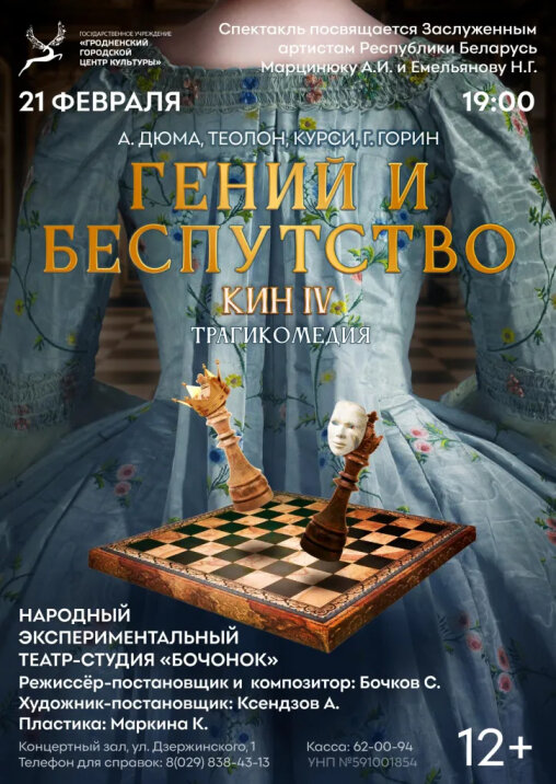 Мы рады пригласить Вас на спектакль «Гений и беспутство» (КИН IV). Судьба артиста драматична, когда заканчивается в нищете и забвении. Таково, очевидно, свойство людей: сначала они плачут и смеются над твоим искусством, а потом тебя же ненавидят за те чувства, которые ты в них вызвал.