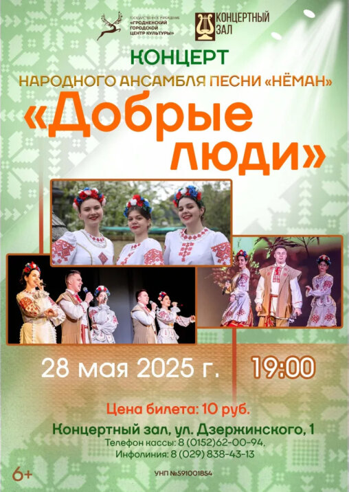 Погрузитесь в мир народной музыки! 28 мая в Концертном зале народный ансамбль песни «Нёман» представит программу «Добрые люди». Зрителей ожидает яркое представление, наполненное прекрасными мелодиями и высоким уровнем вокального мастерства коллектива. Сольные номера, ансамбли, танцы — всё это в одном концерте! Не пропустите!