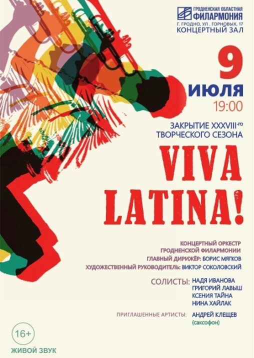 Горячие ритмы латины – самбы, чачи, румбы, сальсы и меренги, красивейшие кубинские мелодии, прекрасные голоса солистов, профессиональные танцоры, а также изумительные импровизации на саксофоне, флейте, гитаре, фортепиано – все это вы сможете услышать и увидеть в нашей новой программе “VIVA LATINA!”. Этот концерт никого не оставит равнодушным, - ведь готовит его концертный оркестр под управлением Бориса Мягкова с его авторскими аранжировками, а петь по-испански для вас будут Григорий Лавыш, Надя Иванова, Нина Хайлак и Ксения Тайна.