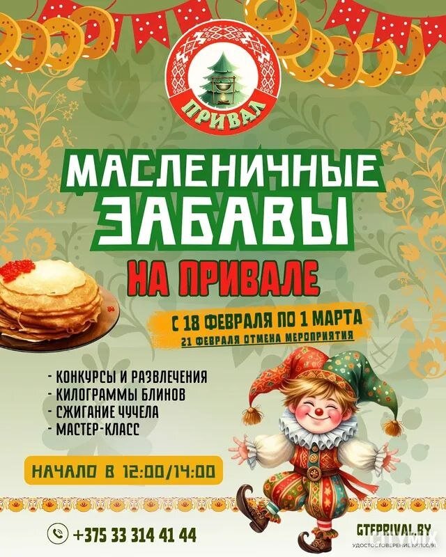 Для семейного отдыха и праздника на свежем воздухе отлично подойдут «Масленичные забавы на Привале». Гостей ждут народные игры, весёлые состязания, активные развлечения и, конечно, блины с разнообразными начинками.