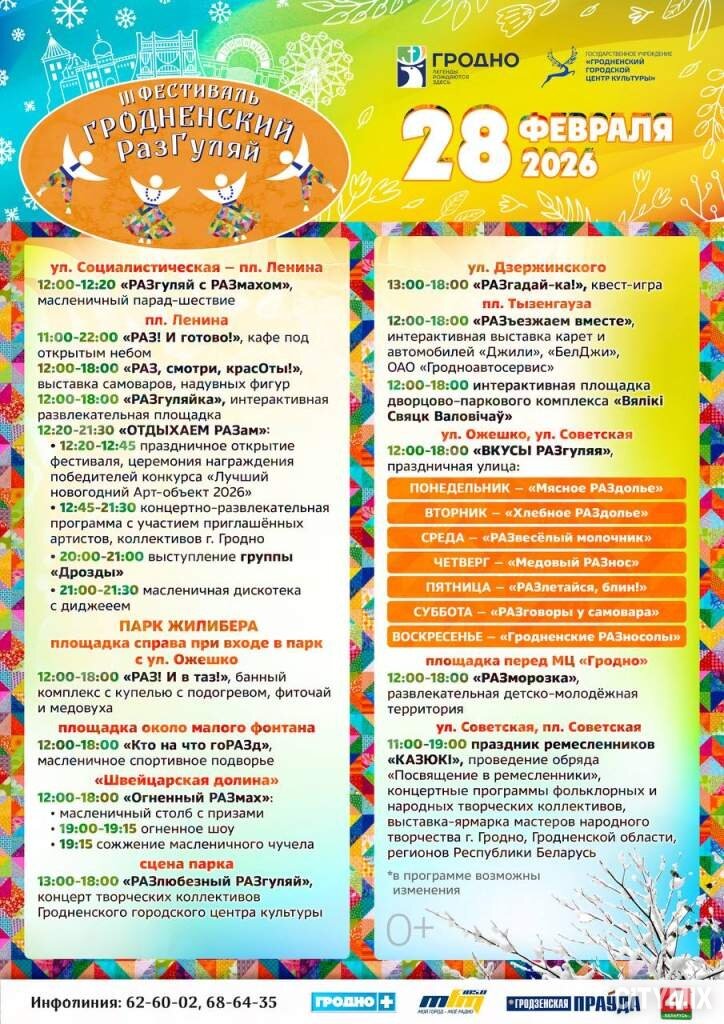Главное городское событие Масленицы — яркий и масштабный фестиваль «Гродненский РазГуляй». В этот день центр Гродно превратится в одну большую праздничную площадку с парадом, концертами и ремесленными рядами.