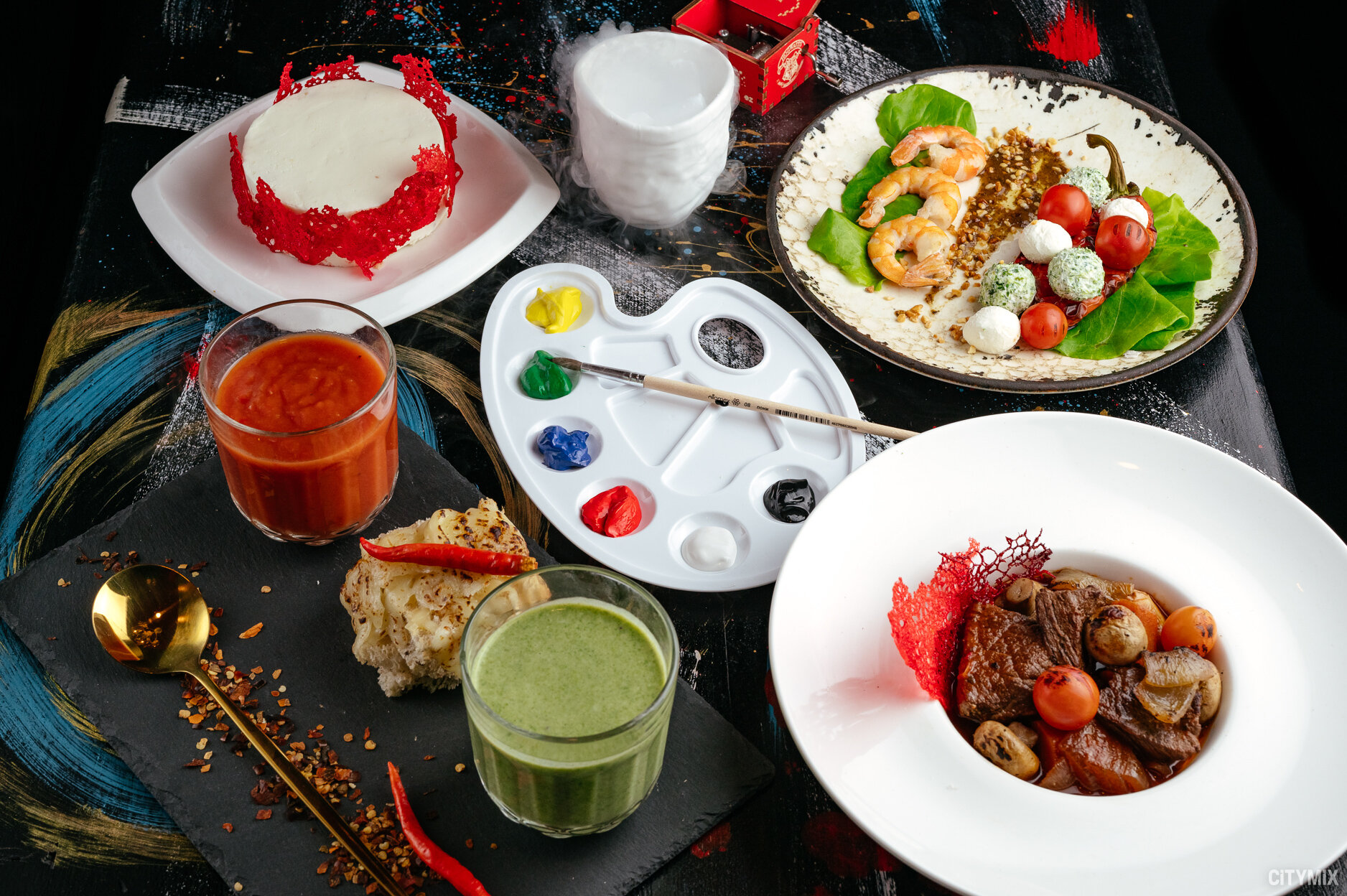 - Сет супов: гаспачо и шпинатный крем-суп с брускеттой из хлеба на закваске и фермерского сыра.
