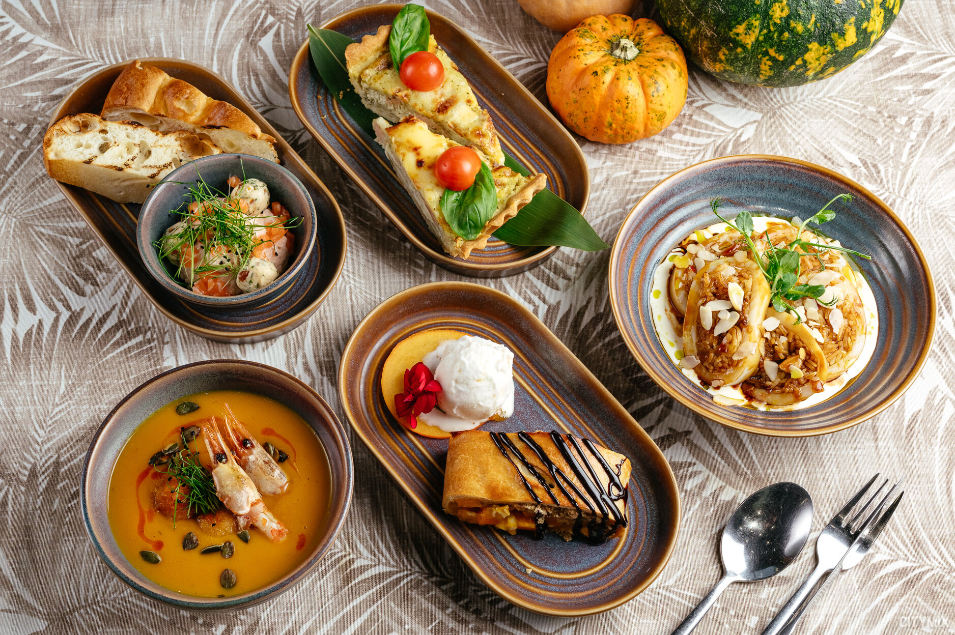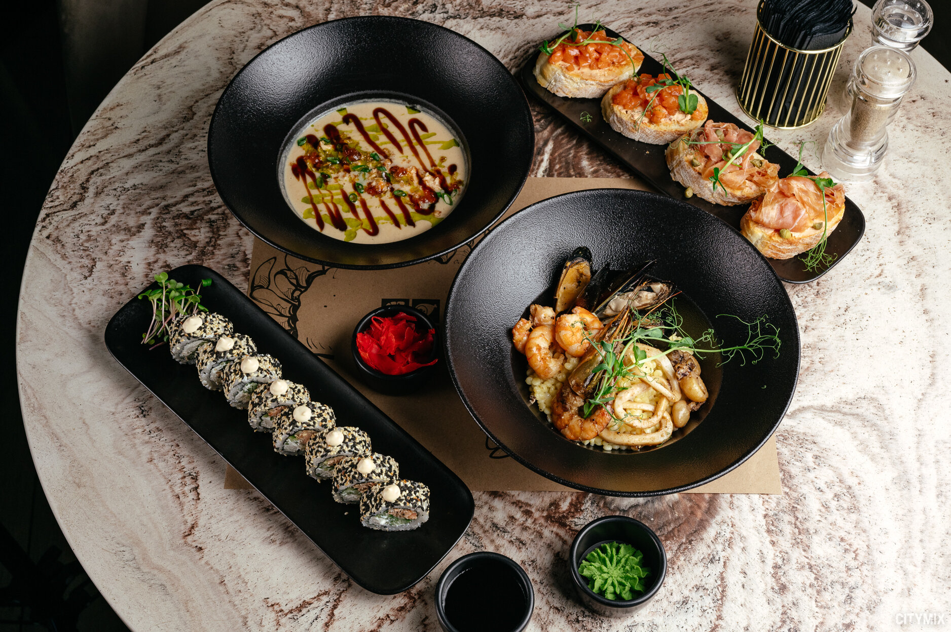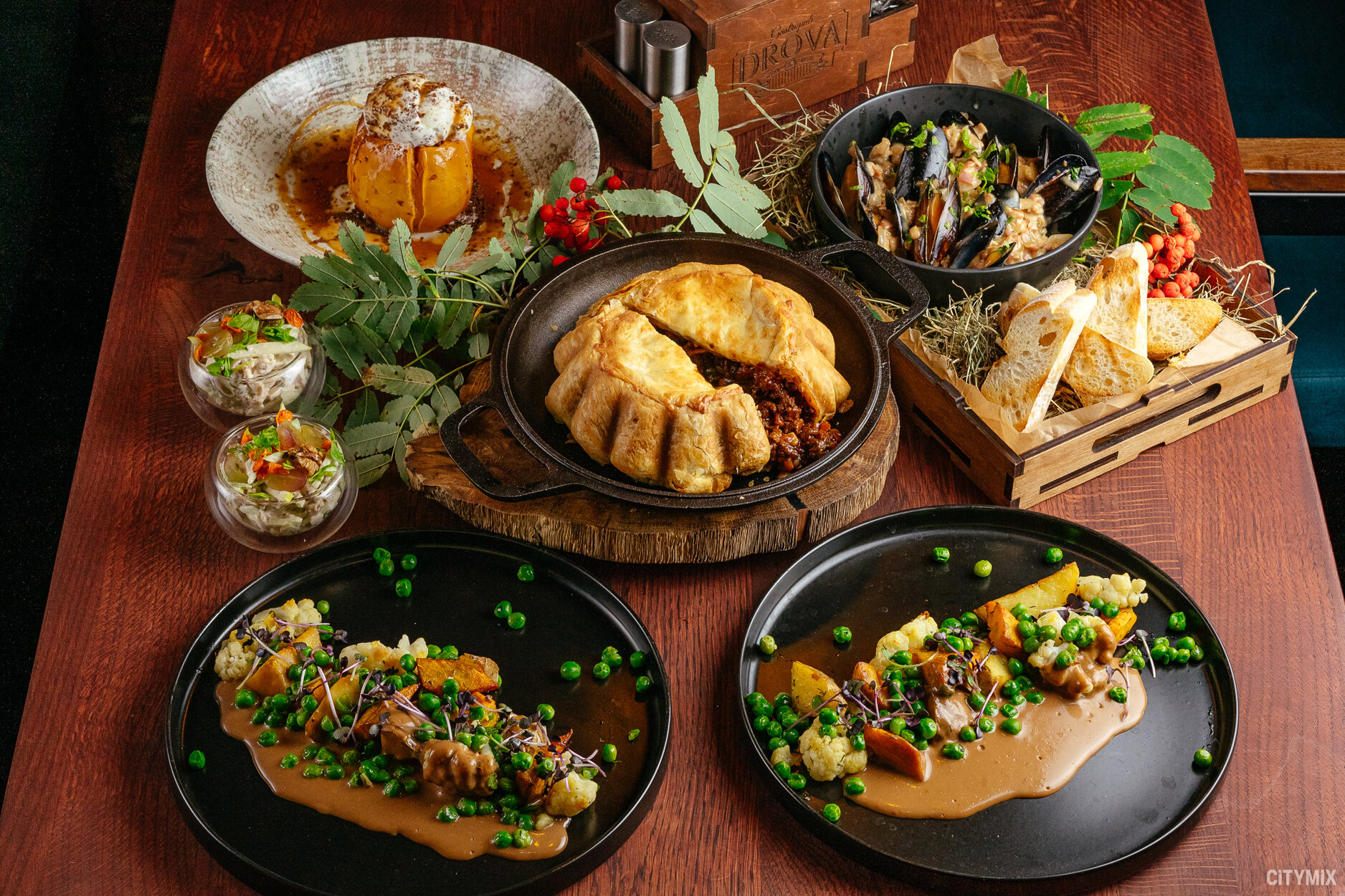 - Мидии карри в печеном картофеле с кремом из лесных грибов.