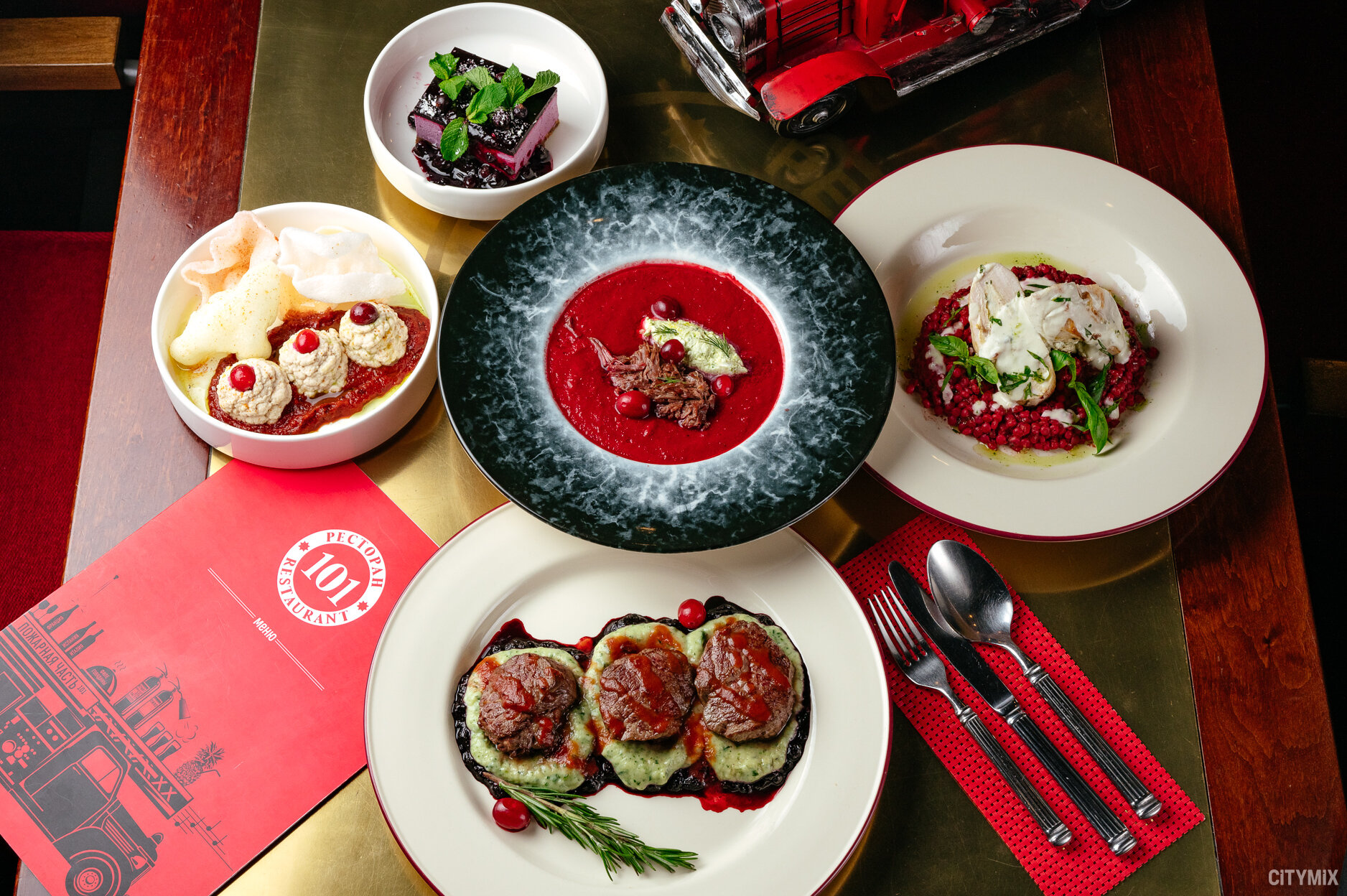 - Карпаччо из свеклы и свиной корейки с зеленью и копчёным соусом.
