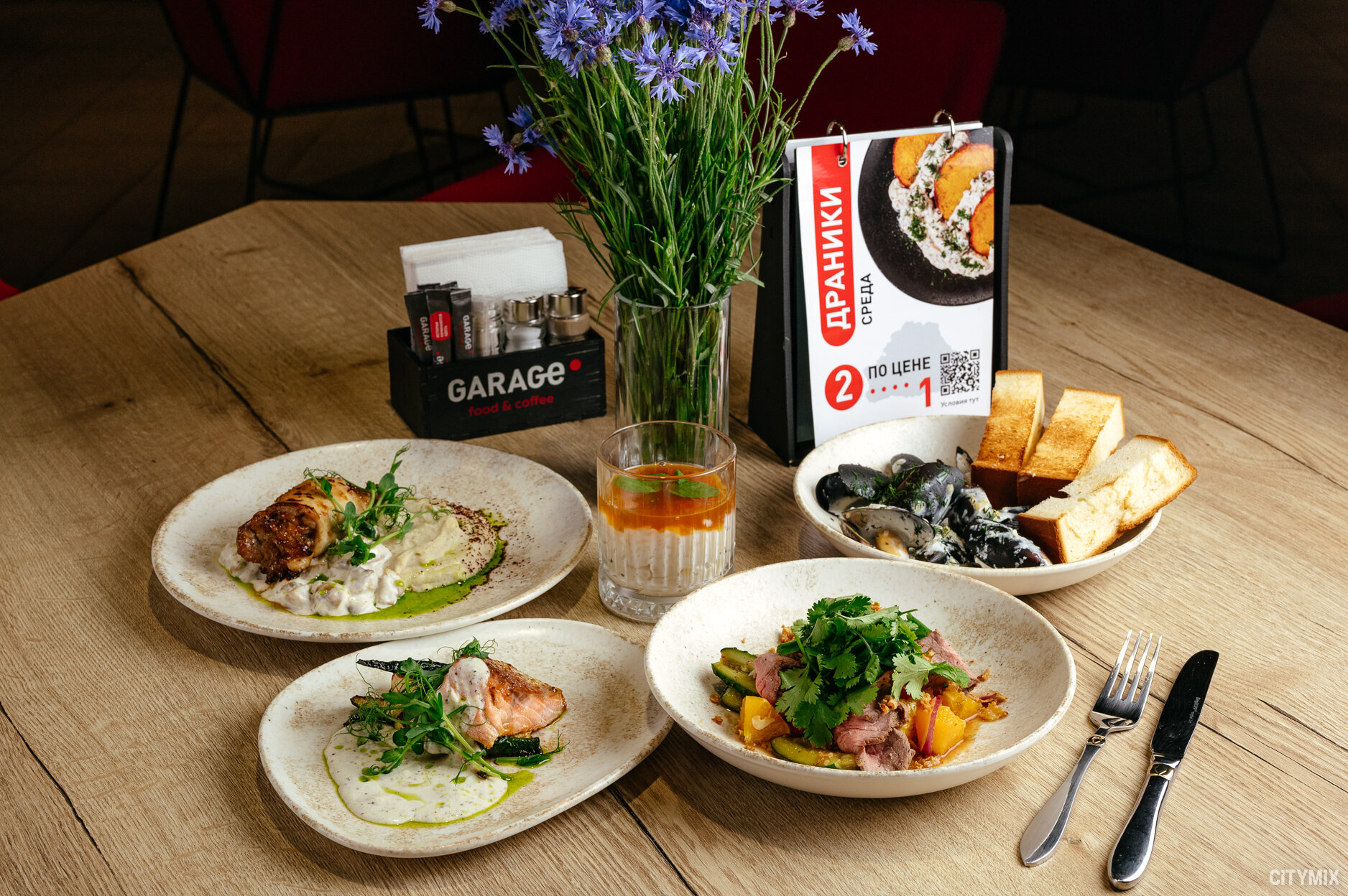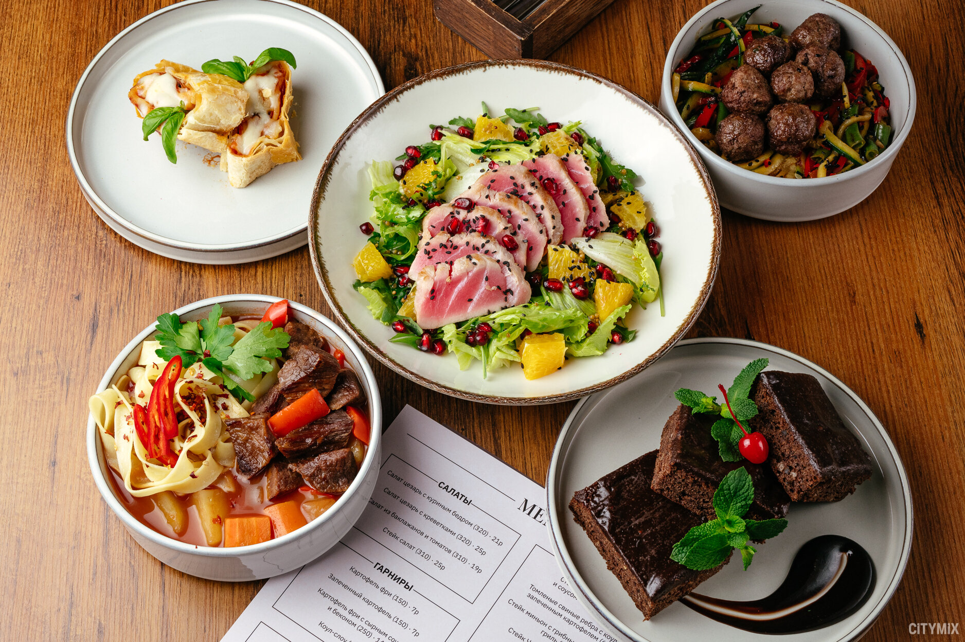 - Салат с тунцом на гриле, микс салатом, гранатом и апельсином в медово-горчичной заправке.