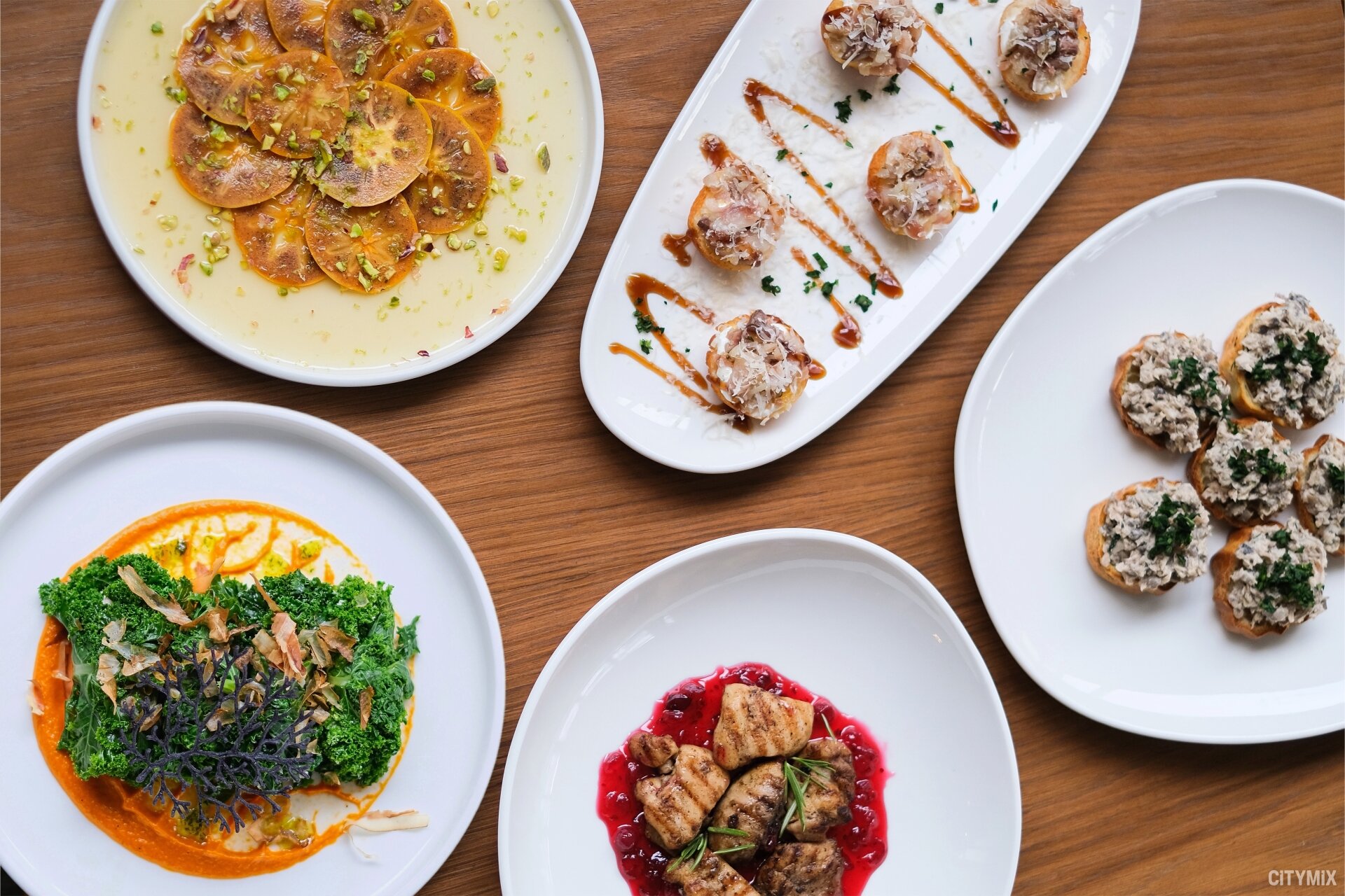 - Кальмар, фаршированный трубачом и морепродуктами под устричным соусом и хлопьями миндаля с соусом «Том Кха».