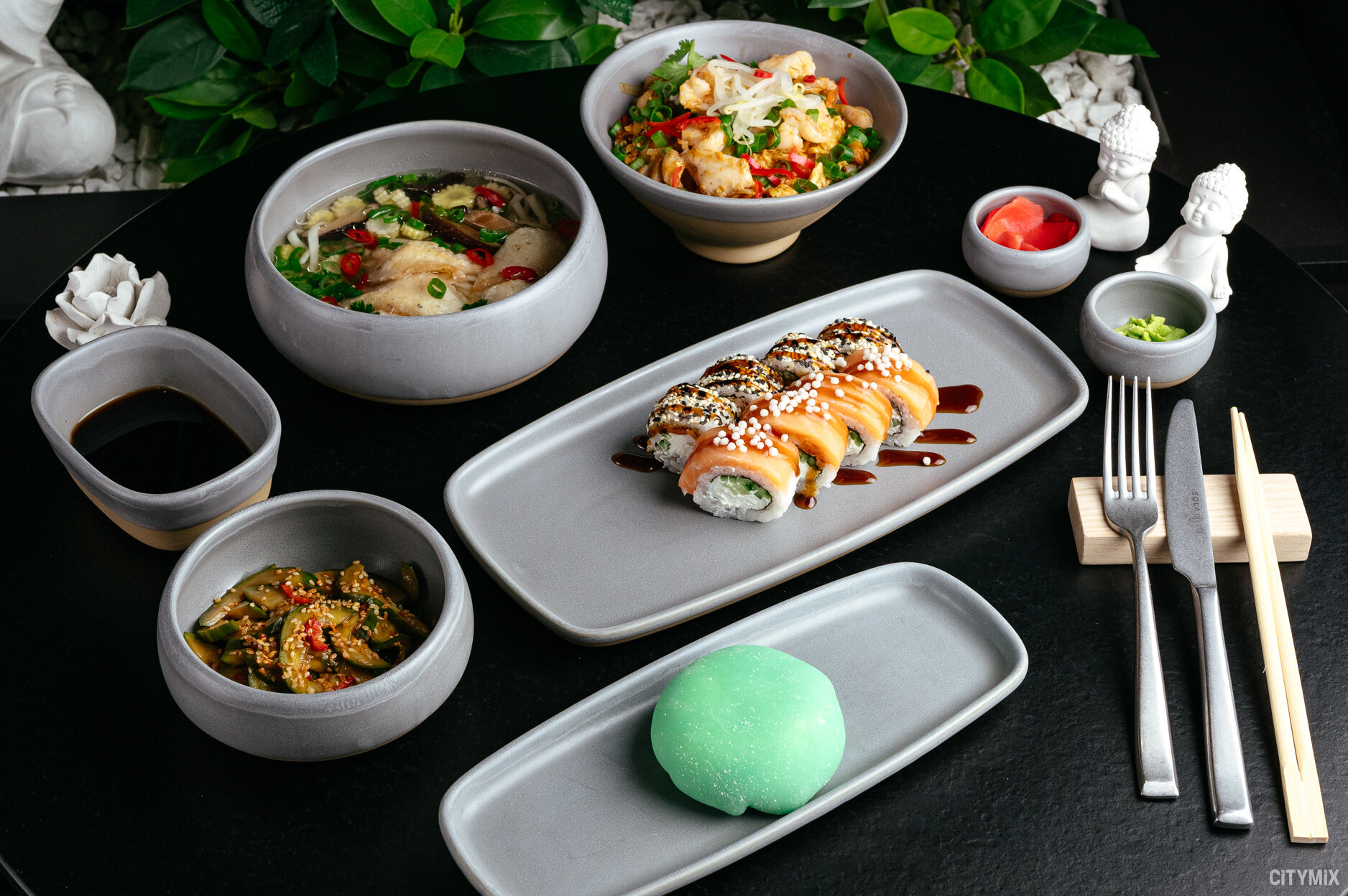 - Набор гарниров (васаби, имбирь, соевый соус).