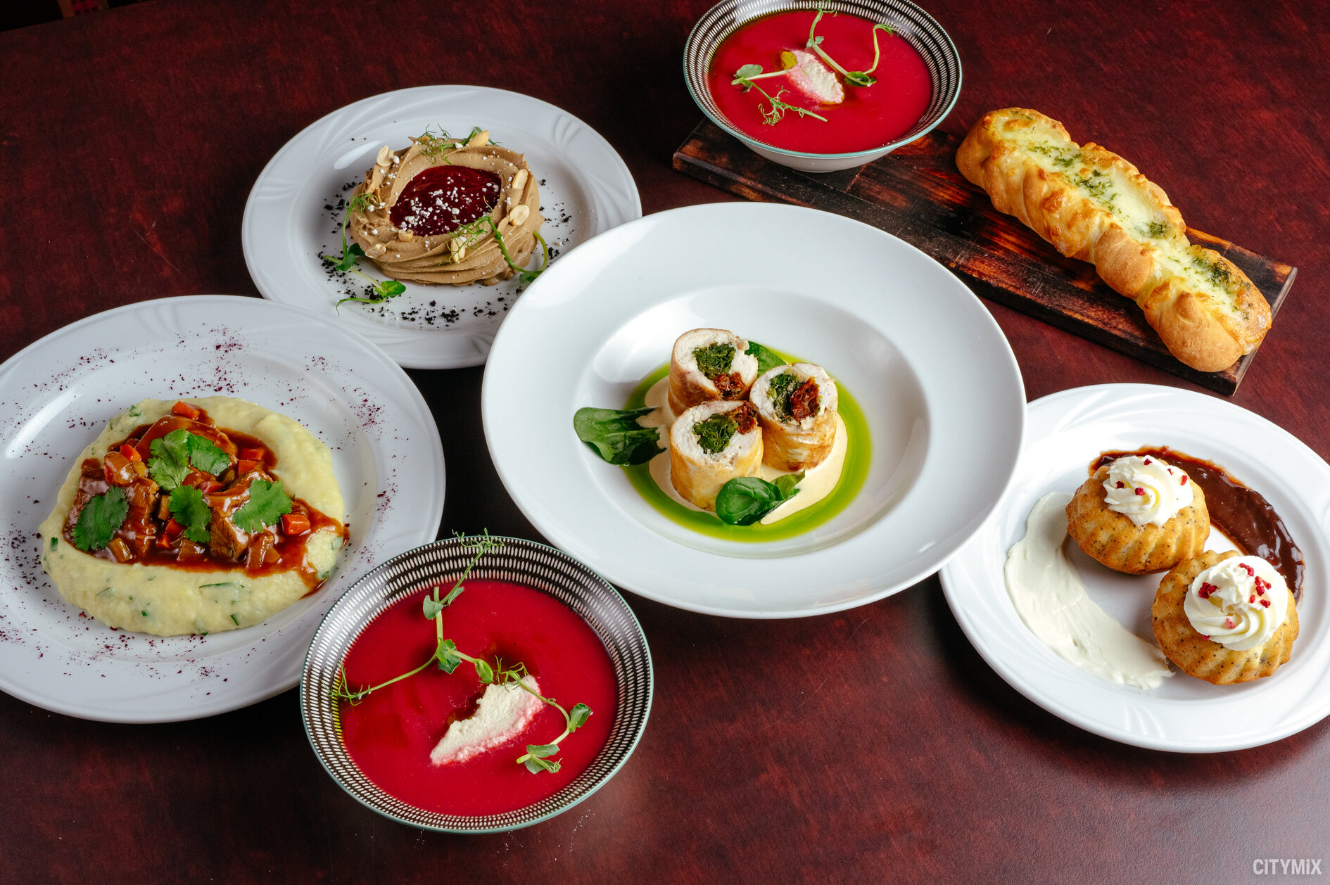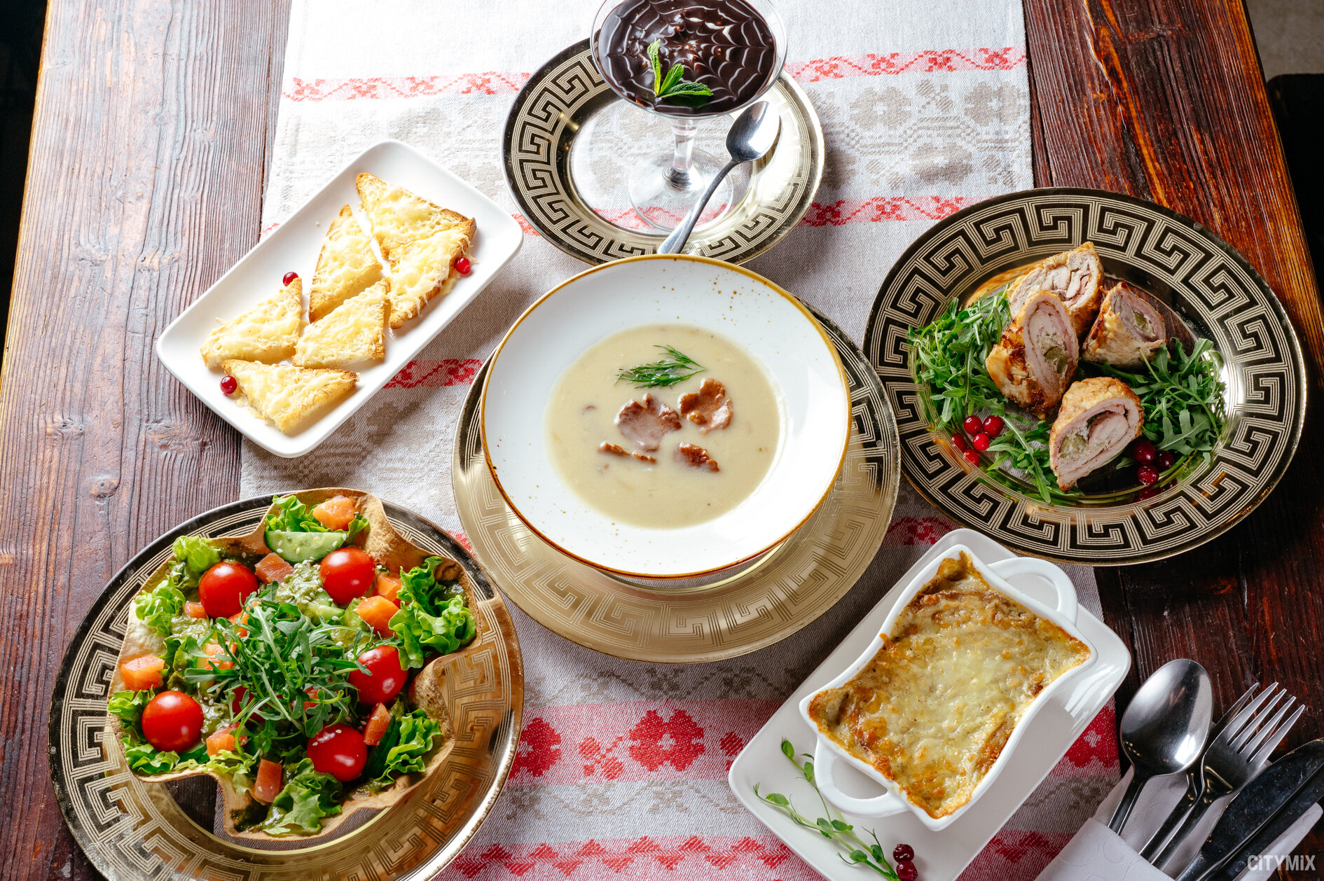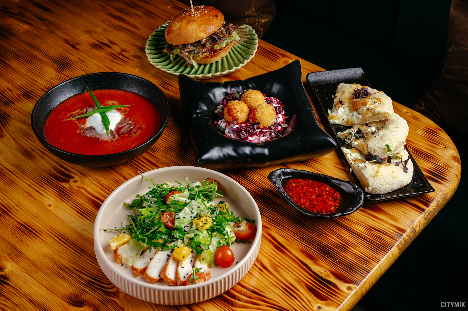 - Крем-борщ с ростбифом, чесночной сметаной и лепешкой с травами и домашним сыром