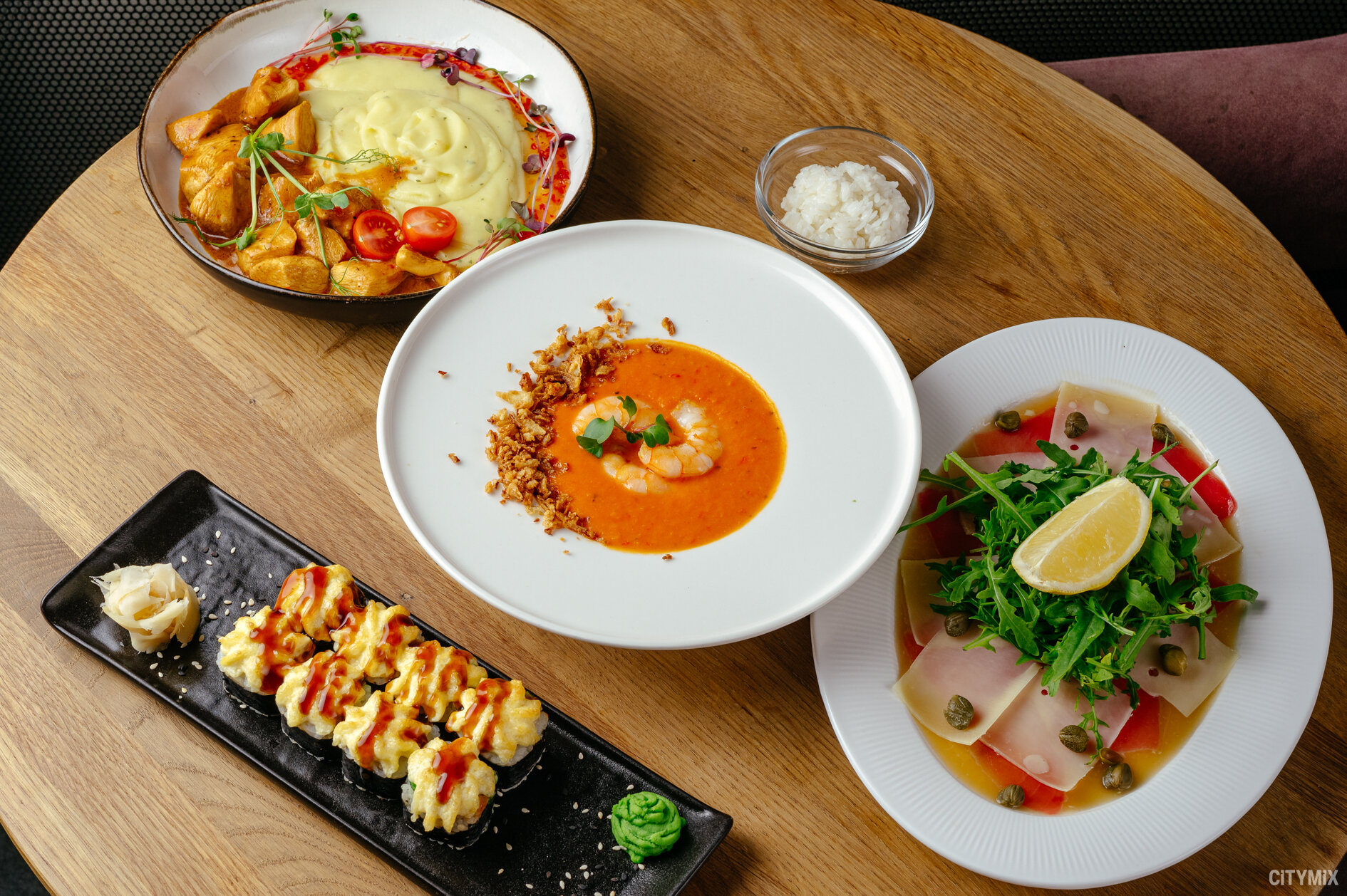 - Чизкейк «Дубайский шоколад» с сорбетом манго-маракуйя: фисташковый мусс чизкейк, тесто катаифи, молочный шоколад, сорбет манго-маракуйя