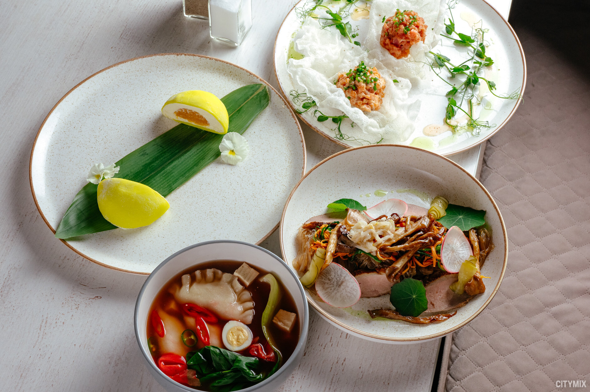 - Салат из маринованных овощей гриль и пармы (подается одновременно со стейком, можно использовать в качестве гарнира): парма, микс салат, печеный перец, маринованные томаты, огурцы кимчи, эмульсия на оливковом масле и кинзе, мусс из копченого баклажана, ростки подсолнечника, выдержанный сыр