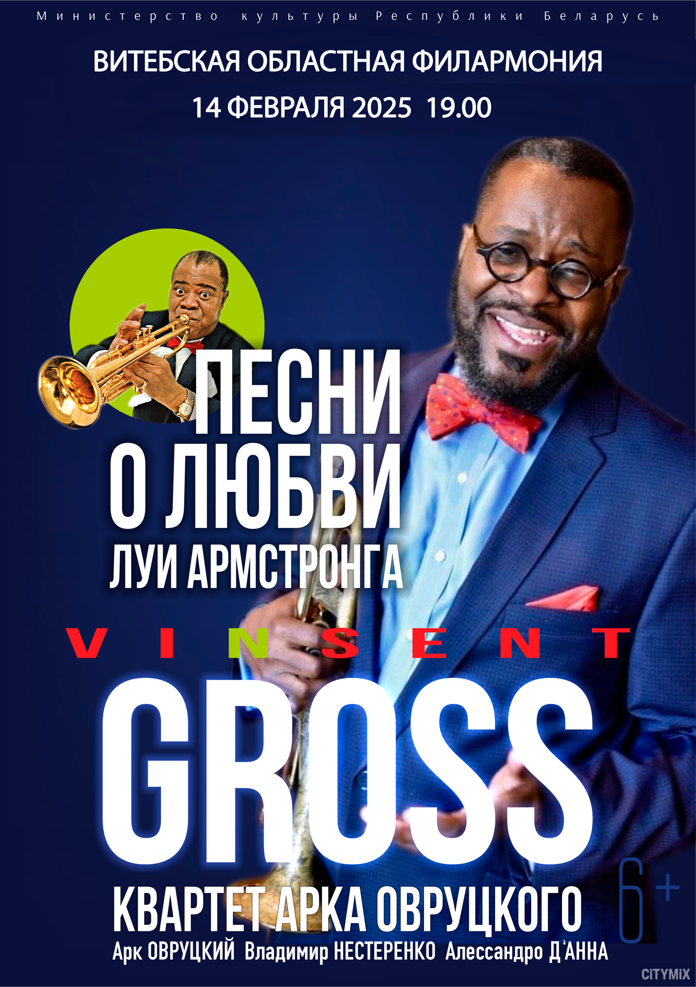 В День всех влюбленных Витебская филармония приглашает на концерт, наполненный романтикой и классическим джазом. Уникальный вокалист из Балтимора Винсент Гросс вместе с международным квартетом Арка Овруцкого исполнит легендарные композиции из репертуара Луи Армстронга. В этот вечер прозвучат нежные и чувственные мелодии, среди которых My Funny Valentine, What a Wonderful World, Cheek To Cheek и другие. Атмосфера живого звука, чарующий вокал и теплый свет сцены создадут идеальную обстановку для незабываемого праздника любви.