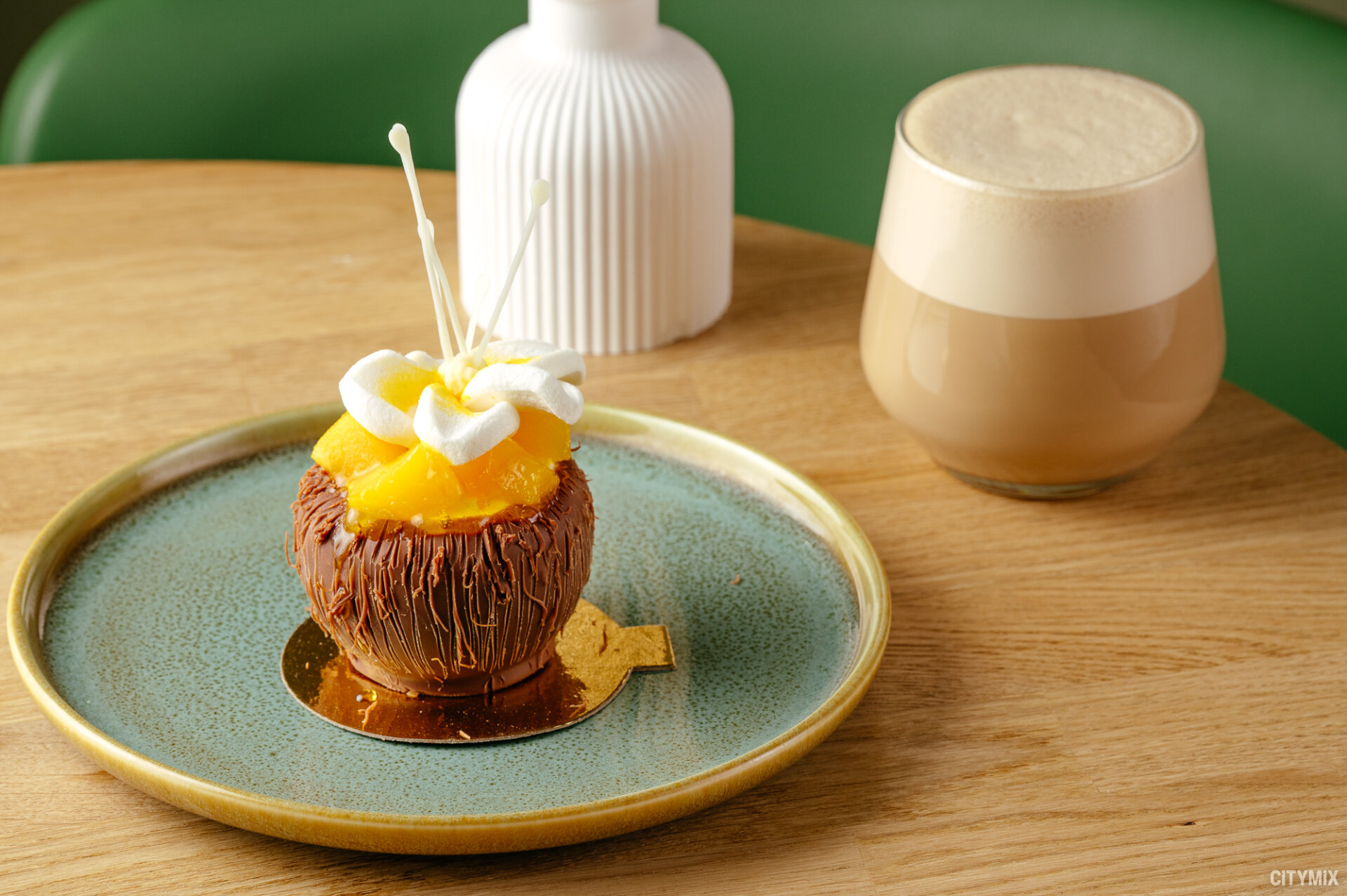 - Муссовое пирожное «Кокос» (кокосовый мусс, персиковая начинка, шоколад), 100 г